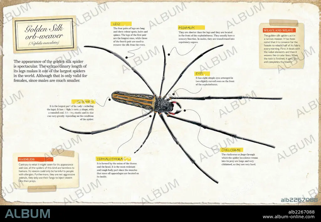 Infographic of the anatomy of Golden Silk orb-weaver (Nephila maculata).
