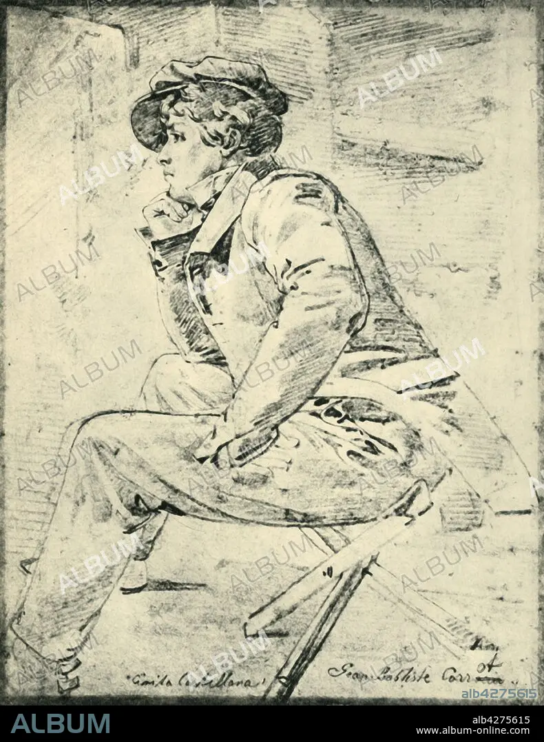 Caption: Camille Corot, 1826, (1943). Portrait of the French painter Jean-Baptiste-Camille Corot (1796-1875). Drawing in the Staatliche Kunstsammlungen Dresden, Germany. From "Europäische Handzeichnungen", (Five Hundred Years of European Drawings), by Bernhard Degenhart. [Atlantis-Verlag Berlin, Zürich, 1943]