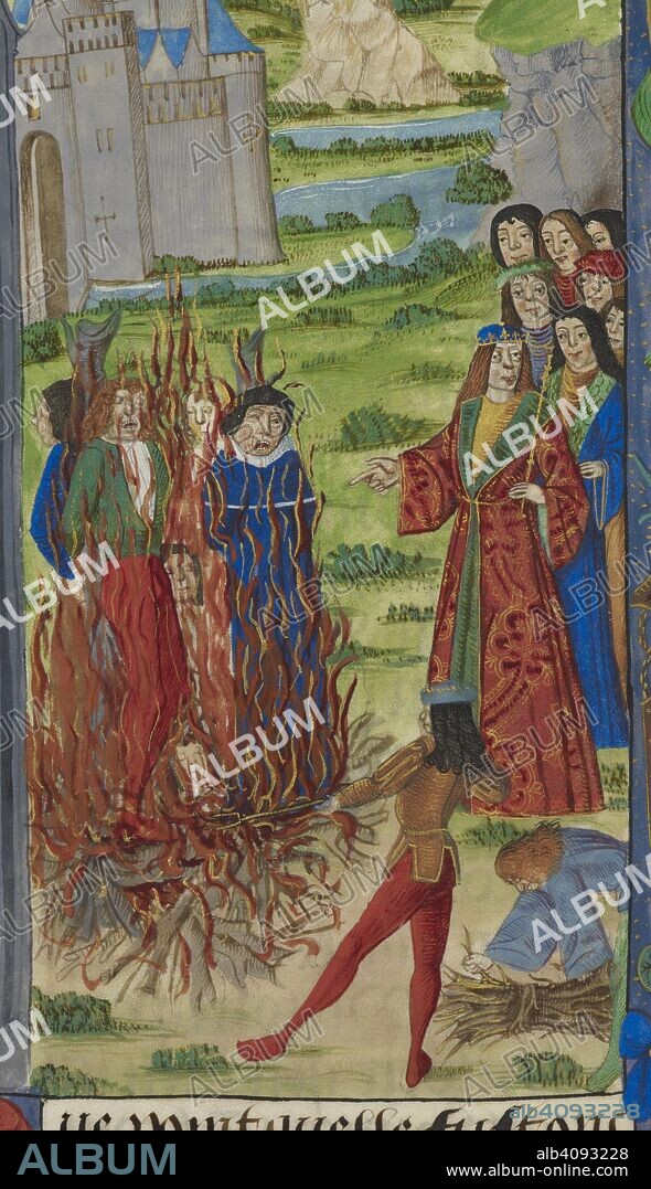 King Philip II of France presides at the burning of the heretical followers of Amaury of Chartres. In 1209 ten of his followers were burnt before the gates of Paris, and Amalric's own body was exhumed and burnt and the ashes given to the winds. Amaury de Chartres or Amaury de Bene or Amalric of Bena, was a philosopher and theologian of the French twelfth century. . Chroniques de France ou de Saint Denis (from 1108 to 1270). France, N. (Calais?), 1487. Source: Royal 20 E. III f.177v.