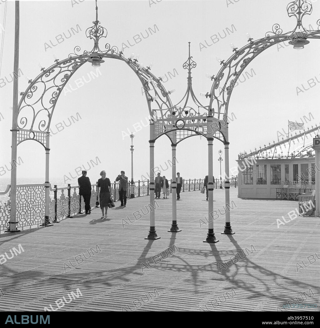 Palace Pier, Brighton, East Sussex, 1960s. View of the pier looking towards a cafe. Holidaymakers stroll beneath the decorative iron arches which are lit up at night. The pier was built between 1891-1899.