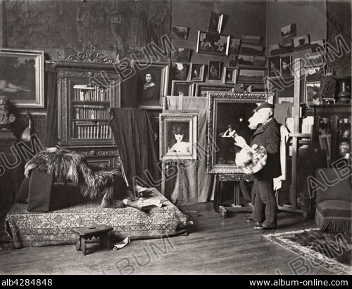 Caption: French painter Jean-Jacques Henner in his studio located 11 rue Pigalle in the 9th arrondissement in Paris.. On the easel, the artist is finishing 'Solitude', which is now located at the musée Jean-Jacques Henner in Paris.. c.1885. Albumen print. Jean-Jacques Henner (1829-1905)