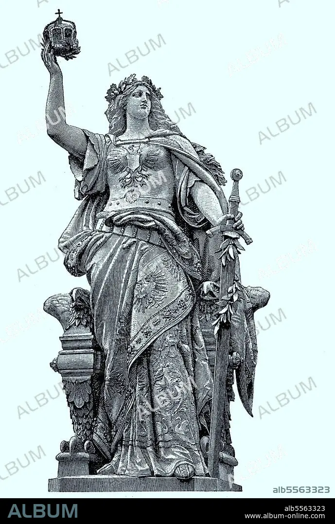 Das Niederwalddenkmal ist ein Denkmal im Niederwald bei Rüdesheim am Rhein in Hessen, die zentrale Figur die 10, 5 Meter hohe Germania-Figur, die rechten Hand die wiegefundene Kaiserkrone und lken Hand Reichsschwert hält, digitale verbesserte Reproduktion ees Origaldrucks von 1880, Deutschland