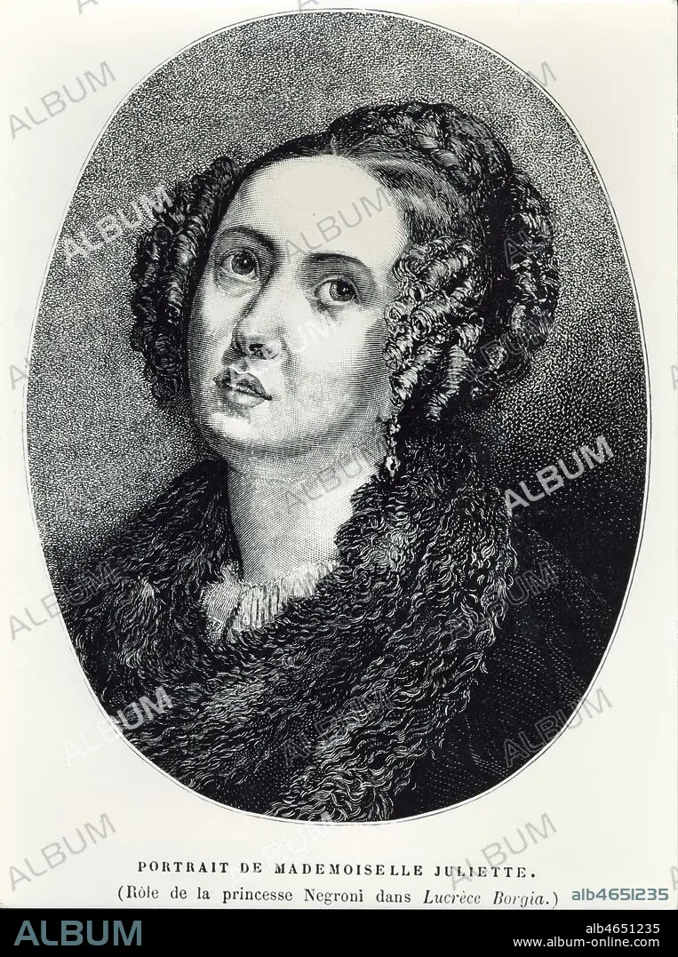 'Portrait de mademoiselle Juliette - Role de la princesse Negroni dans Lucrece Borgia' piece de Victor HUGO (1802-1885). Gravure anonyme de 1833 . Juliette DROUET (1806-1883) devient la maitresse de Victor HUGO suite a cette piece de theatre. Credit : Collection Kharbine-Tapabor