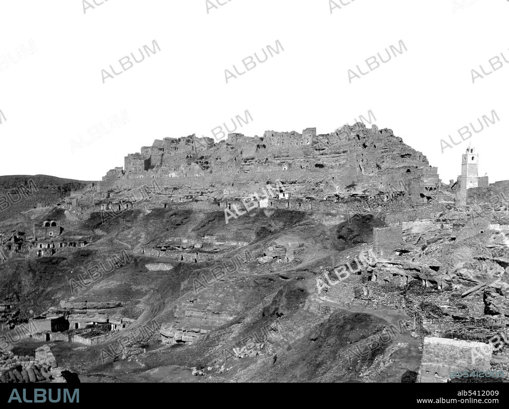 Berber cave dwellings on hill, Chenini, Tunisia. Chenini is a ruined Berber village in southern Tunisia. Located on a hilltop near a modern village of the same name, Chenini was a fortified ksar (plural ksour.) A ksar is the North African term for Berber castle (Berber fortified village). Like other ksour created by North African Berber communities, Chenini was built on a hilltop - in this instance, between two hilltop ridges - to help protect it from raiding parties. The oldest structures on the hillside date back to the 12th century. The building material of the entire structure is normally adobe, or cut stone and adobe. F. Soler, circa 1880 and 1900.
