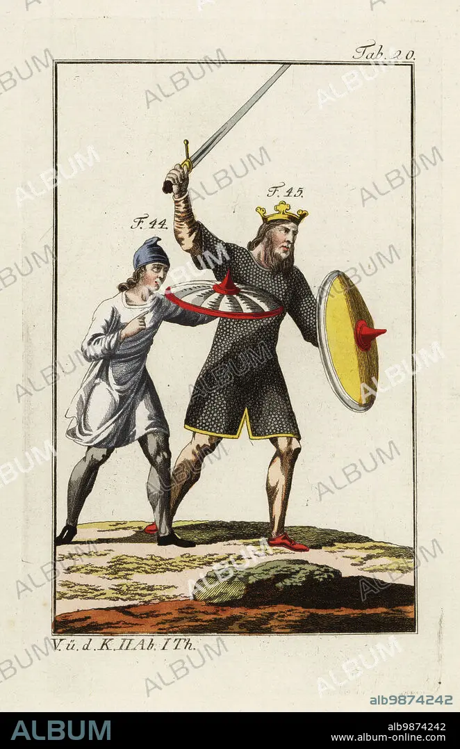 Caption: Anglo Saxon king in battle wearing a crown, knee-length chain-mail tunic or lorica, a suit of armour reserved for royalty in the 8th century. He carries a yellow shield and brandishes a sword above his head 45. Identified as Pepin II, the Younger, King of Aquitaine, 823c.864. His equerry wears a blue cloth hat Phrygian cap and white tunica, and carries a white shield rimmed with scarlet 44. Handcolored copperplate engraving from Robert von Spalart's Historical Picture of the Costumes of the Principal People of Antiquity and Middle Ages, Vienna, 1796.
