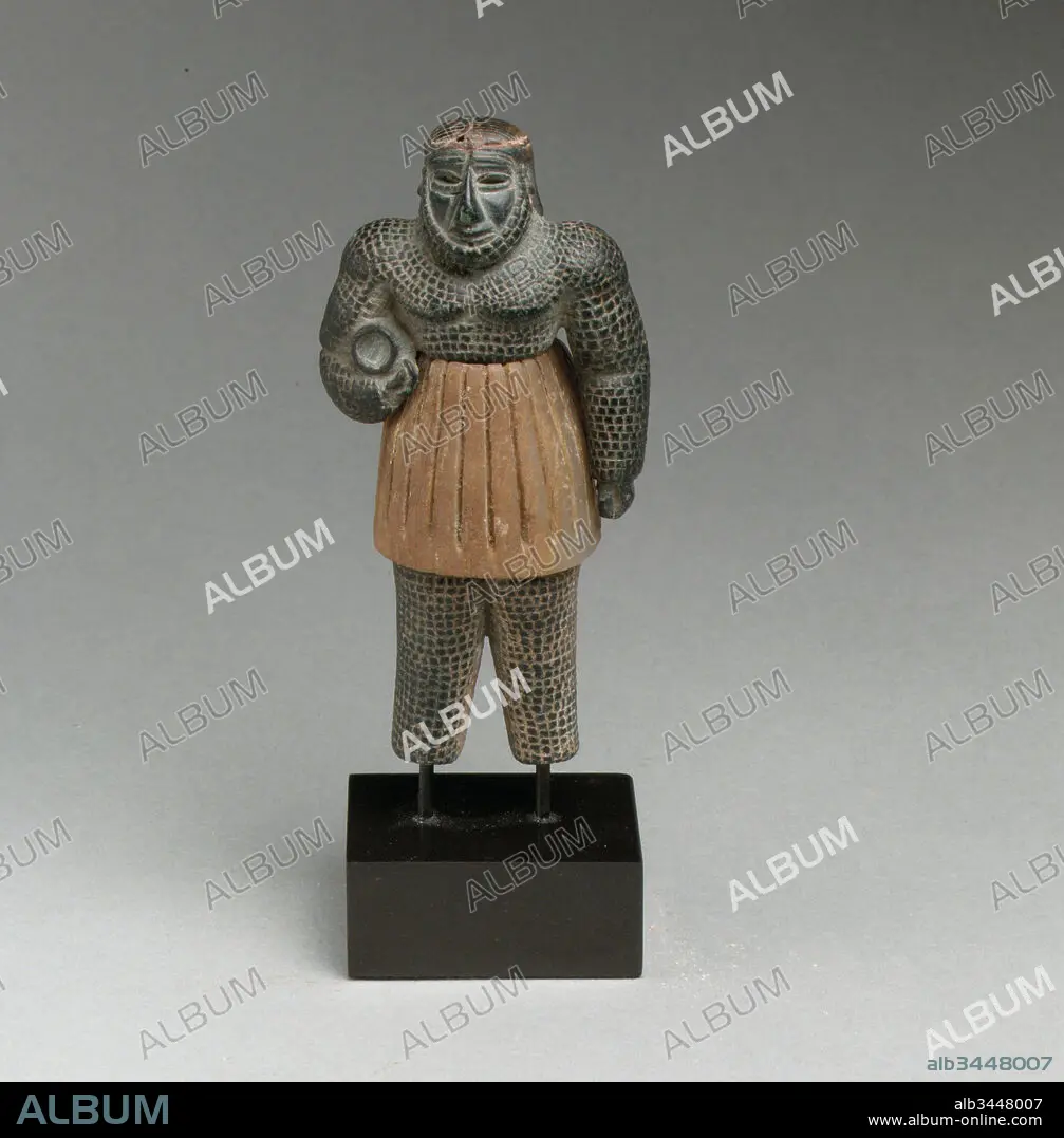 Caption: Monstrous male figure, Bronze Age, ca. late 3rd–early 2nd millennium B.C., Bactria-Margiana or eastern Iran, Bactria-Margiana Archaeological Complex, Chlorite, calcite, gold, iron, H. 4 in. (10.1 cm), Stone-Sculpture, In the world of the ancient Near East, images and beings that combined human and animal qualities were thought to possess supernatural powers. This small yet potent figure, with its human face and serpentine-scaled body, probably represents such a creature, enlivened and charged with magical efficacy whether propitious or demonic