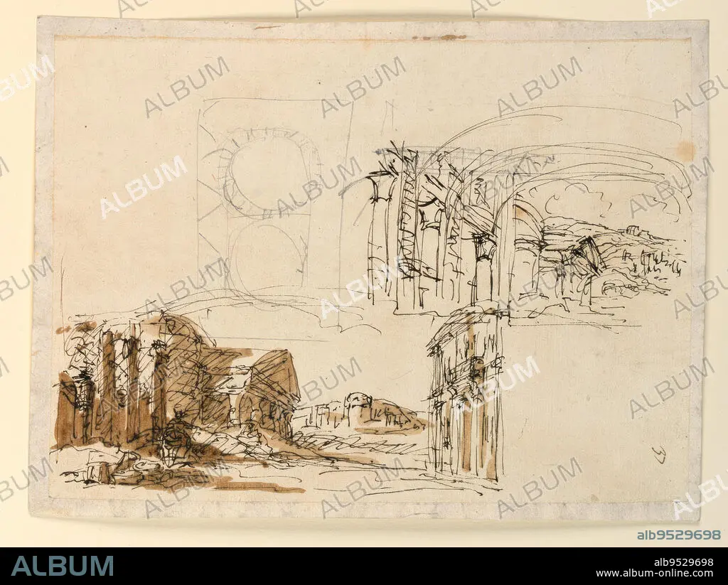 Caption: Two different sketches of classical buildings in landscape and rough sketch of ground plan. Date: early 19th century. Pen and brown ink, brush and brown wash, graphite on lined off-white laid paper.
