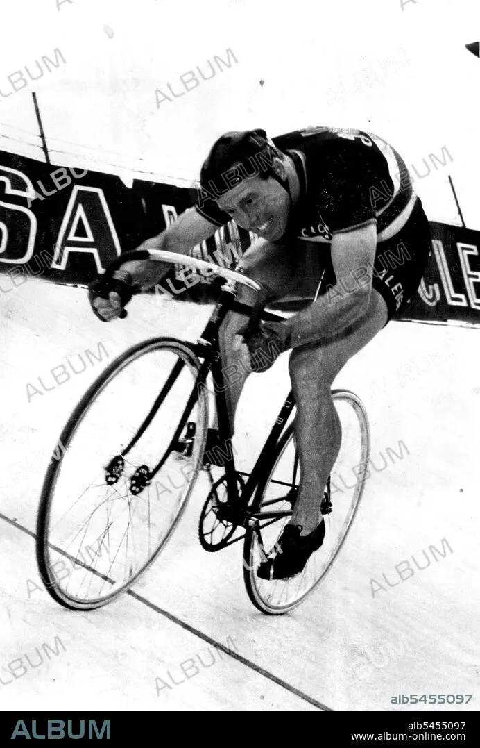 British Champion sprint cyclist Reg Harris, training at the North Essendon board track for his Victorian race. December 08, 1953.