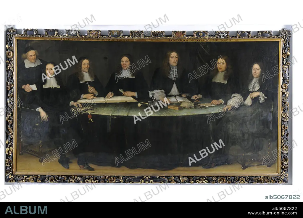 Caption: painting, Pieter Leermans (Attributed to), 1667, canvas, oil paint, painted, With frame: 412 x 219 x 9cm (4120 x 2190 x 90mm), chair, man's portrait, regent piece, interior, table, Group portrait of six regents of the St Elisabeth guest house seated at a table. There is a man on the left behind, a servant. In original wooden carved and gilded frame with on top the arms and names of the regents and the year in 1667. On the left, right and bottom the frame is decorated with curly motifs and with flowers and leaves. Not signed, 1867