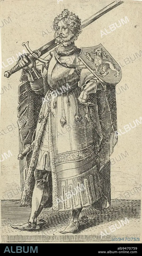 Caption: Portrait of Floris V, Count of Holland and Zeeland, standing to the left in armour with the coat of arms of Holland on his shoulder and holding a sword. Print from a series of 36 prints with full-length portraits of counts and countesses of Holland, Portrait of Floris V, Count of Holland and Zeeland Counts and Countesses of Holland , print maker: Adriaen Matham, Haarlem, 1620, paper, engraving, h 130 mm × w 80 mm