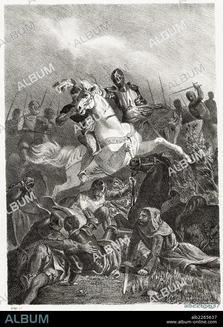 Automatic translation: History of Spain. Prince Philip I of Taranto (1278-1332) is taken prisoner by the Sicilians at the battle of Falconara, in 1299. Engraving from 1872