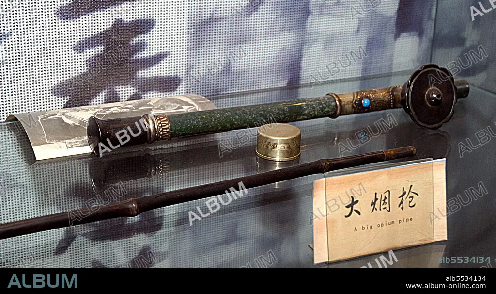 Title: A 19th century, opium pipe on display Beijing, China
