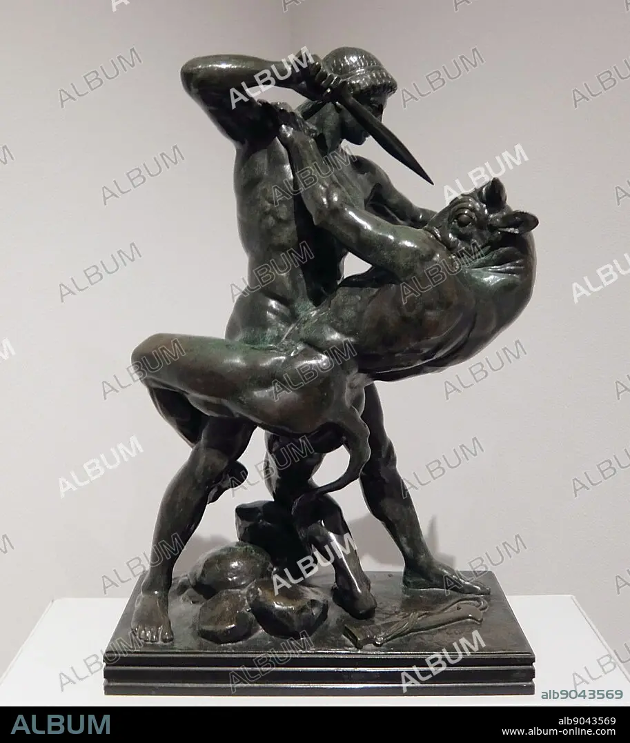 Caption: Bronze sculpture titled 'Theseus Slaying the Minotaur' by Antoine-Louis Barye. Antoine-Louis Barye (1795-1875) a Romantic French sculptor.