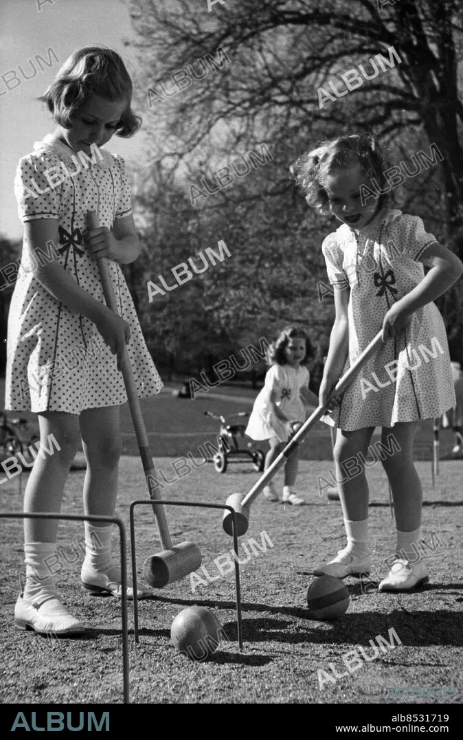 ARKIV STOCKHOLM 19420529.. Hagaprinsessorna spelar krocket i Hagaparken. Från vänster Margaretha och Birgitta och i bakgrunden Désirée, som blir 4 år den 2/6.. Foto: SVT Bild / Kod: 5600. AB Text & Bilder. Mapp: Hagaprinsessorna. Bilderna tagna till sessan Désirées födelsedag den 2 juni 1942. K 86 HI