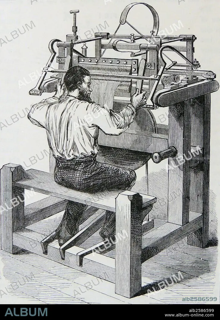 Caption: Stocking-frame weaver at work on a treadle operated machine. Engraving, London, c1880.