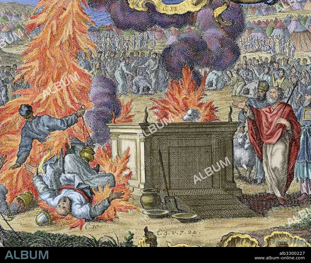 God's vengeance against the sons of Aaron, Nadab and Abihu. Leviticus, Chapter 10. Engraving. Colored.