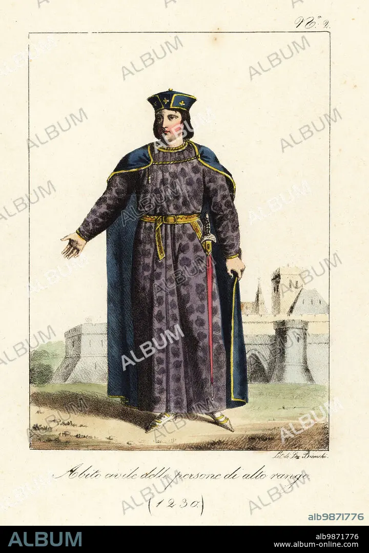 Caption: Costume of a French nobleman, 1230. In cap, mantle tied at the shoulder, long robe, belt with sword. In front of a stone castle. Handcoloured lithograph by Lorenzo Bianchi after Hippolyte Lecomte from Costumi civili e militari della monarchia francese dal 1200 al 1820, Naples, 1825. Italian edition of Lecomtes Civilian and military costumes of the French monarchy from 1200 to 1820.