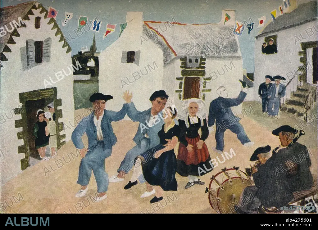 'Dancing Sailors, Brittany' , 1930, (1936). Village square with men and girls in Breton costume dancing by English painter John Christopher Wood (1901-1930) shortly before his tragic death at Salisbury railway station. Oil on board. From "The Studio Volume 111" [London Offices of the Studio, London, 1936.]