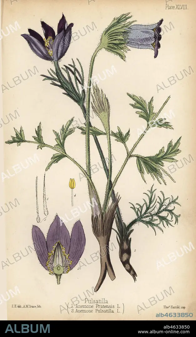 Caption: Small pasque flower, Anemone pratensis 1 and pasqueflower, Pulsatilla vulgaris (Anemone pulsatilla) 2. Handcoloured lithograph by A.M. Traice after an illustration by Edward Hamilton from Edward Hamilton's Flora Homeopathica, Bailliere, London, 1852.