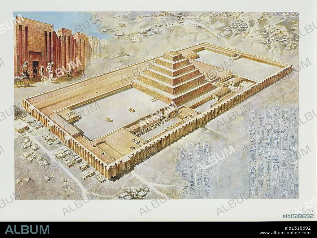 Egyptian Civilisation - Saqqara. Reconstructed 'Step Pyramid' complex of Djoser. Color illustration