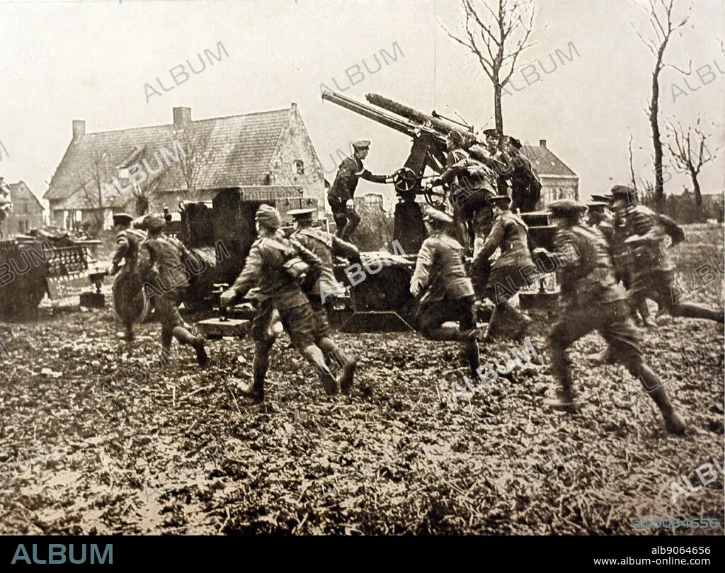 Caption: A photograph from the First World War, showing soldiers running into an area while two gunners man an anti aircraft gun just next to them. Circa 1914-1918.