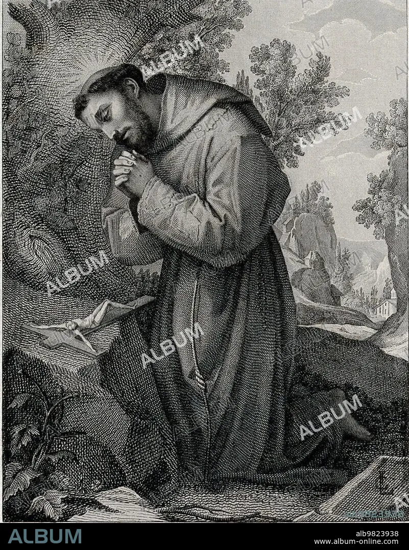Caption: St. Francis of Assisi; Giovanni di Pietro di Bernardone; 1181 or 1182 to 3 October 1226; the founder of the Order of Friars Minor; Ordo fratrum minorum; Franciscans; St. Francis of Assisi in the Wilderness; kneeling in front of a crucifix. Engraving by A. Calzi after Pompignoli after L. Cardi da Cigoli. Painted 1720 1780; Historical; digitally restored reproduction from a 19th century original