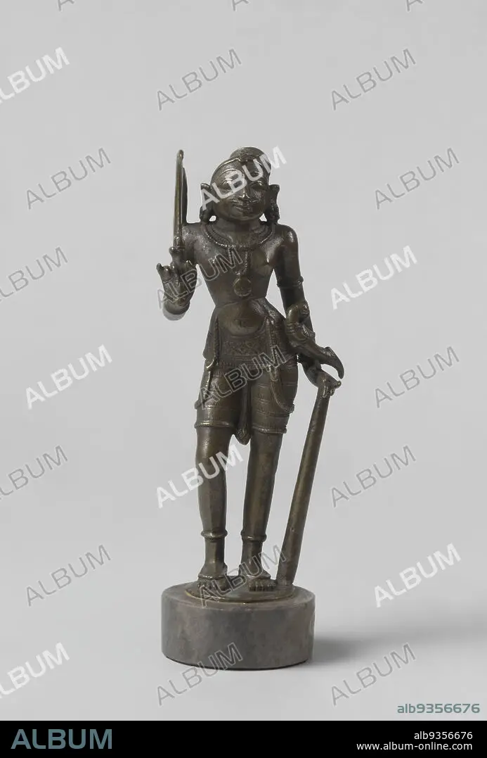 Caption: Karuppannasamy, Karuppannasamy (also known as Karuppu, Karuppar or Karuppannaswamy), a local god of South India, helper of Aiyanar and protector of the village, stands upright, his right leg slightly bent at the knee. He rests his left hand on a club. In his raised right hand he holds a sickle (Tamil: arival). From his left hip hangs a knife with scabbard, its handle shaped like a parakeet., maker: anonymous, Tamil Nadu, c. 1600 - c. 1700, bronze (metal), casting, height 16.8 cm × width 6.4 cm × depth 3.6 cm
