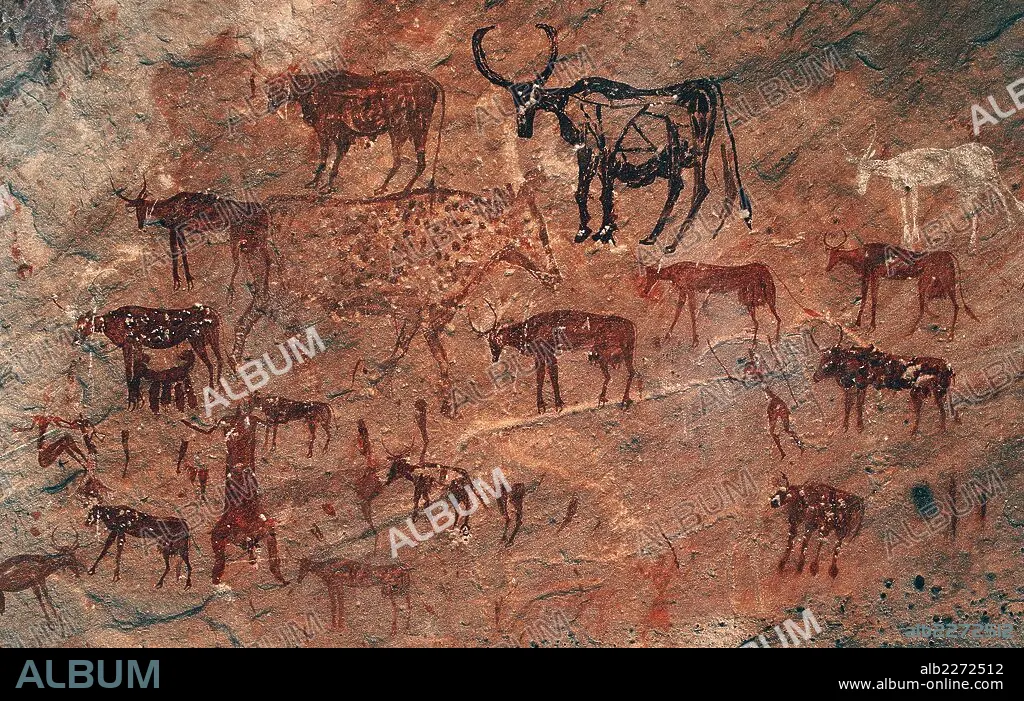 Caption: Cattle, rock painting, Tadrart Acacus Massif (Unesco World Heritage List, 1985), Libya.