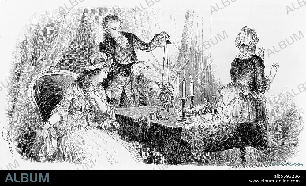 Goethe, Johann Wolfgang von; 1749-1832. Werke: Wilhelm Meisters Lehrjahre (1796). - "Wilhelm zeigt Marianne die Puppen". (Illustr. zum 1. Buch, 3. Kap.). Holzstich, um 1880, nach Zeichnung von Erdmann Wagner (1842-1917). Aus: Goethes Werke, hrsg. v. H.Düntzer, Stuttgart u. Leipzig, o. J.