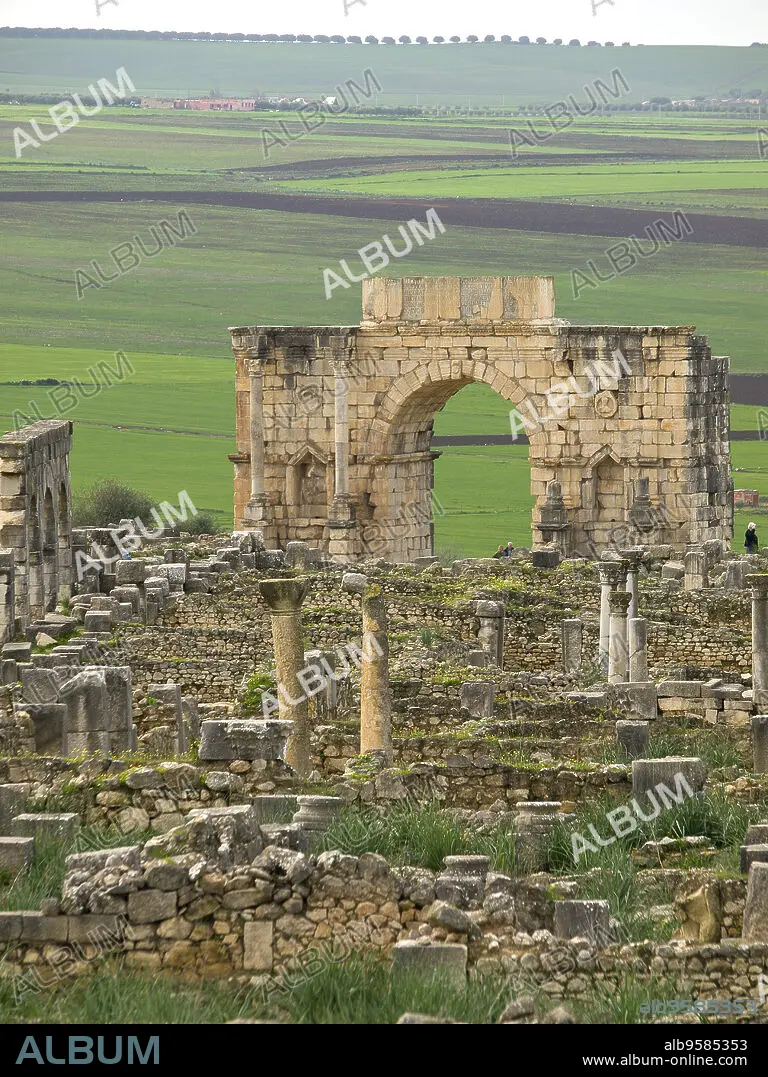 Caption: Ciudad Romana de Volubilis(II d.c.), arco de triunfo, yacimiento arqueologico.Marruecos.