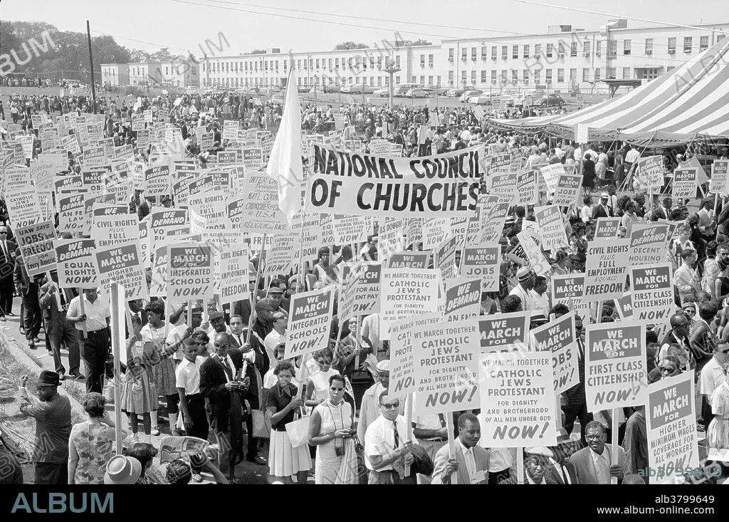 Caption: Entitled: "Marchers, signs, and tent." The March on Washington for Jobs and Freedom was one of the largest political rallies for human rights in United States history and called for civil and economic rights for African-Americans. On Wednesday, August 28, 1963. Martin Luther King, Jr., standing in front of the Lincoln Memorial, delivered his historic "I Have a Dream" speech in which he called for an end to racism. The march was organized by a group of civil rights, labor, and religious organizations, under the theme "jobs, and freedom". Estimates of the number of participants varied from 200,000 to 300,000; it is widely accepted that approximately 250,000 people participated in the march. Observers estimated that 75-80% of the marchers were black. The march is credited with helping to pass the Civil Rights Act (1964) and preceded the Selma Voting Rights Movement which led to the passage of the Voting Rights Act (1965). Photographed by Marion S. Trikosko, 1963.