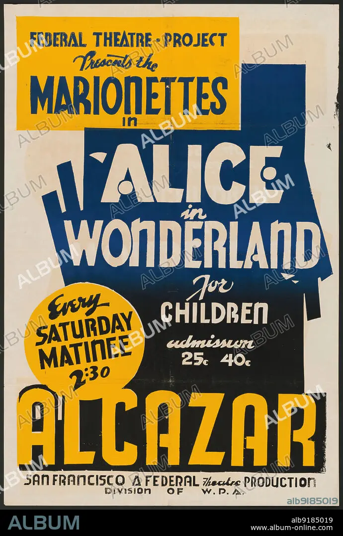 Alice in Wonderland, San Francisco, 1937. 'Federal Theatre Project Presents the Marionettes in "Alice in Wonderland" for Children...Alcazar [Theatre]...'. The Federal Theatre Project, created by the U.S. Works Progress Administration in 1935, was designed to conserve and develop the skills of theater workers, re-employ them on public relief, and to bring theater to thousands in the United States who had never before seen live theatrical performances.
