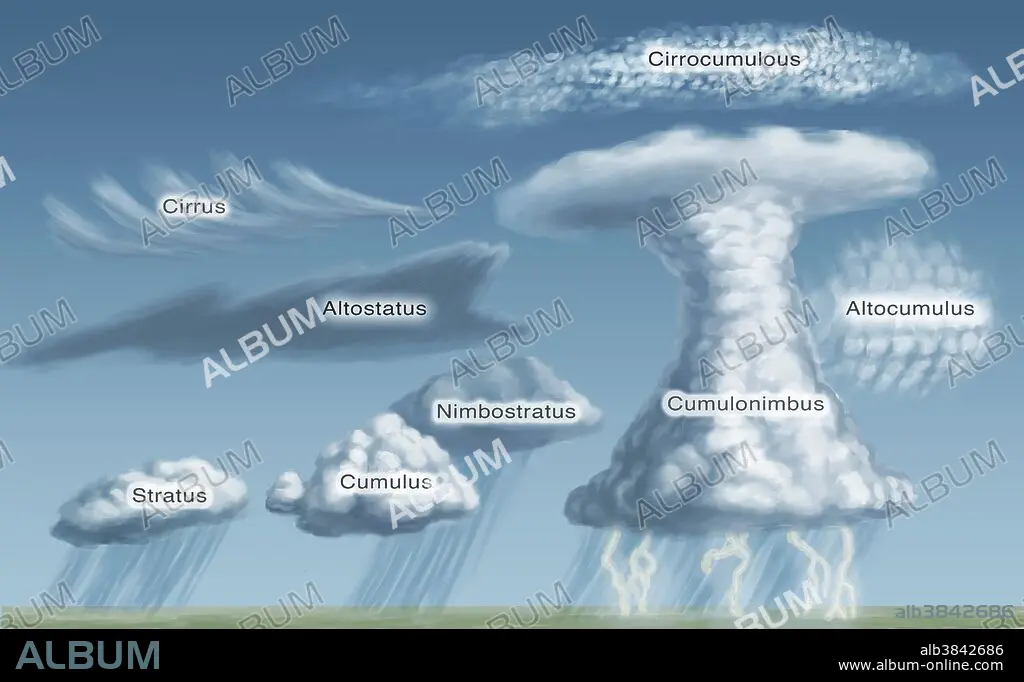 Caption: Illustration of various cloud formations: Cirrus, altostatus, nimbostratus, stratus, cumulus, cumulonimbus, altocumulus, and cirrocumulus.