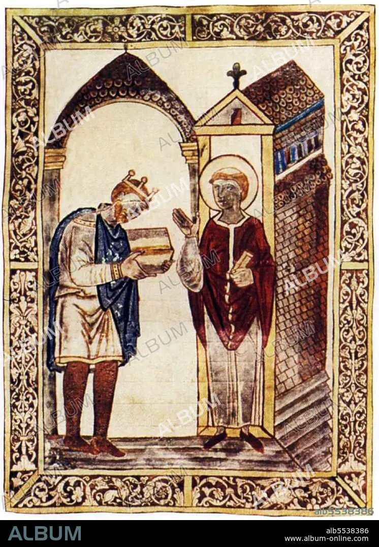 Title: England / UK: Athelstan (c.895-939), King of the West Saxons from 924 to 927, and King of the English from 927 to 939, presenting a book to St Cuthbert. From a 12th century manuscript of Bede's Life of St. Cuthbert.