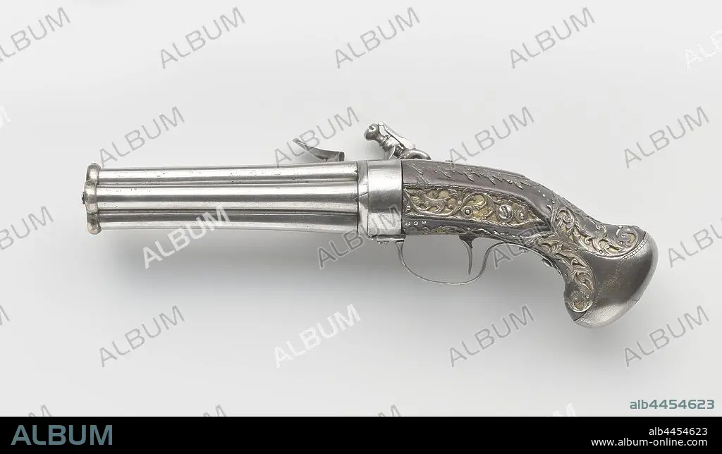Caption: Four-barreled flint running gun, Flint pocket gun with four barrels, part of a couple. The long lock plate is engraved with foliage and signed, the steel is chiseled on the bottom. The four rotatable barrels are held together at the trumpet by an iron ring, behind the mounting plate is a brass cylinder. The flask consists only of a short handle, the butt knob of which is covered with openwork, embossed silver foliage, partly against a brass can background, including a grotesque mask on top of the handle. The fitting consists of an iron trigger guard that must be pulled backwards to unblock the turning mechanism and a silver screw plate, finished and embossed with leafy leaves with a deer against a brass can background, the loading stick is formed by two steel springs in a recess between the barrels., Cornelis Coster, Utrecht, c. 1660, iron (metal), brass (alloy), silver (metal), steel (alloy), engraving, l 27.8 cm l 13 cm d 9.8 mm w 705 gr