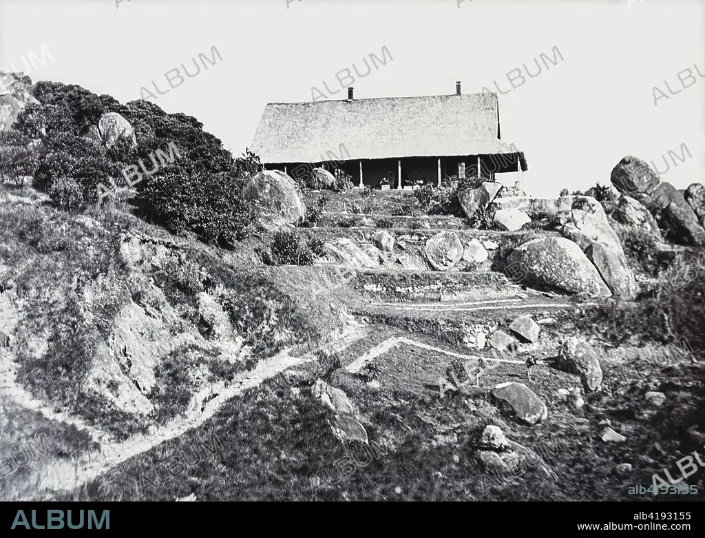 Caption: Magic lantern slide circa 1900.Victorian.Social History. Society for the propagation of the gospel in foreign parts. Missionary work in Madagascar off the coast of Africa. Ramainandro missionary home.