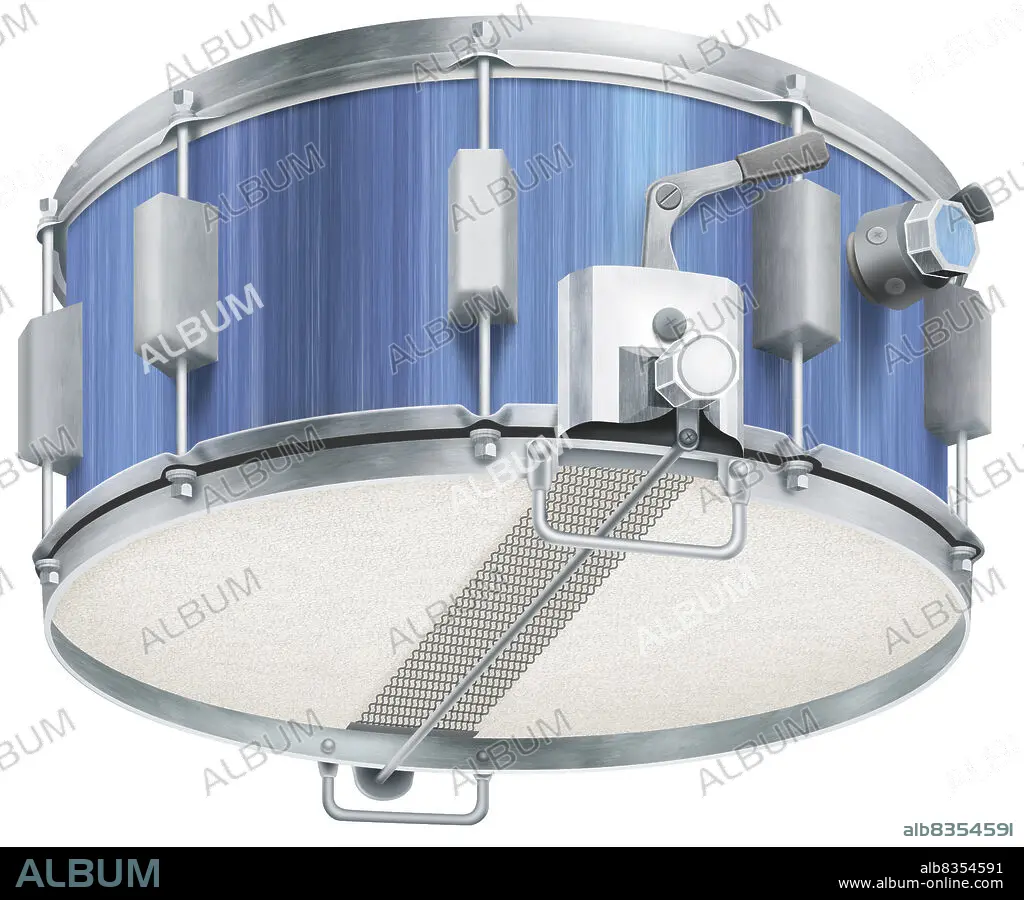 Caption: Drum with snares stretched across the bottom head that produce a rattling sound when the drum is struck.