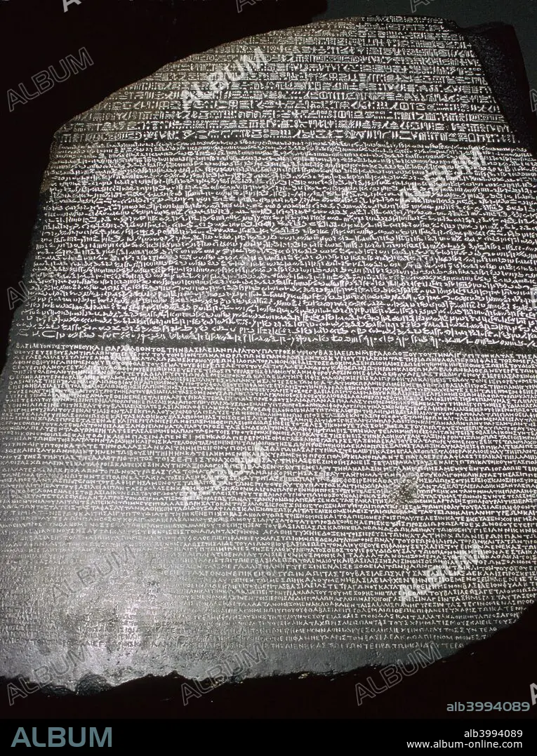 Caption: The Rosetta Stone, showing hieroglyphs, demotic, and Greek scripts, Egyptian, Ptolemaic Period, 196 BC. The inscription is a priestly decree affirming the royal cult of the 13-year-old Ptolemy V. From the British Museum's collection.