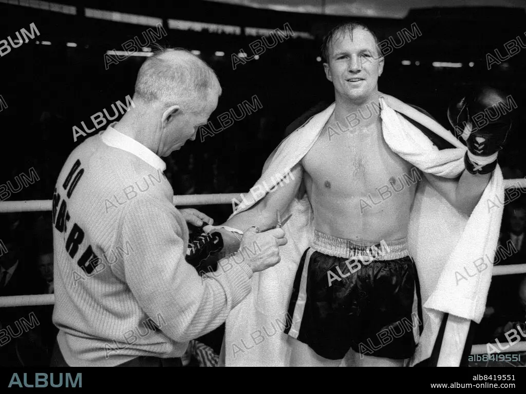 Göteborg 1965-08-14 - Boxningsgala på Nya Ullevi med bl.a. Bosse Högberg och Bosse Pettersson - Cassius Clay ( Muhammad Ali ) och Ingemar Johansson visar upp sig. Här efter Bosse Högbergs seger - hans tränare heter Henry Hallberg - *** Local Caption *** GT. KAMERAREPORTAGE