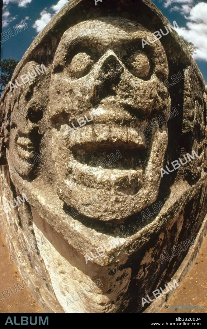 Caption: Tzompanti, an altar decorated with carvings of human skulls, in Chichen Itza. Chichen Itza is a pre-Columbian Mayan city in Yucatan, Mexico.