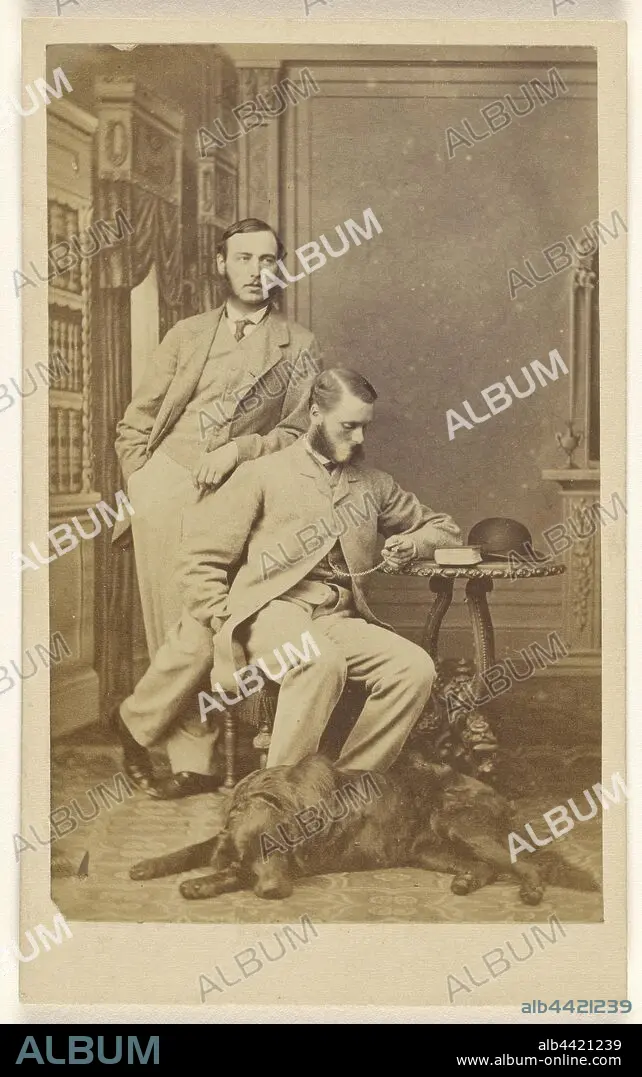 Two unidentified men with muttonchops: one standing, one seated looking at a pocket watch, a dog is at their feet, William Bartholomew (British, active Egham, England 1860s), 1865–1870, Albumen silver print.
