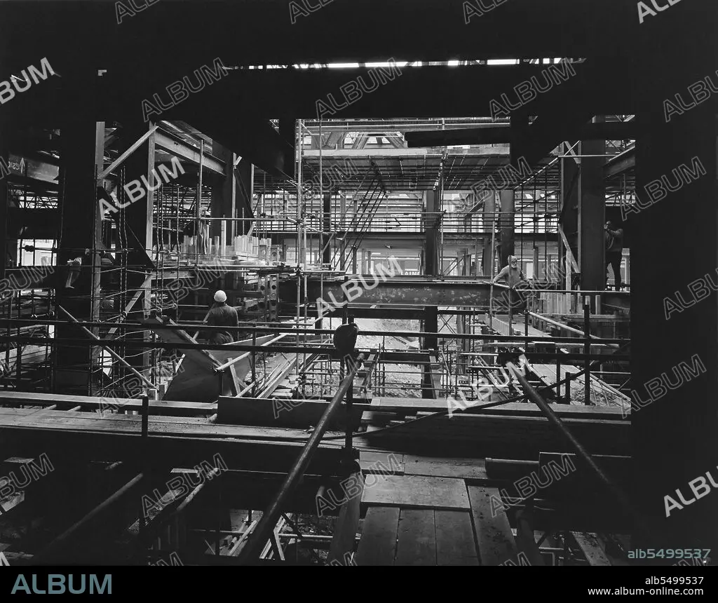 Central London YMCA, Great Russell Street, Camden, London, 26/05/1972. A view looking through scaffolding and the steel frame of the podium and basements of the Central London YMCA building during its construction. It was announced in February 1971 that Laing had started work on a new building at Central London YMCA, to replace an existing building which had opened in the 1910s. The project comprised four residential towers between 6 and 12 storeys high, above a podium and basements. The basements and podium, which were built using reinforced concrete and structural steel, comprised Phase I of the project; the towers were built in Phase II. The building was completed in 1977.