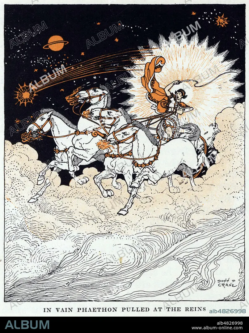 Phaeton tirait sur les rennes en vain (perdant le controle du char solaire de son pere Helios). Illustration de Donn P. CRANE (1878-1944) pour The story of Phaeton repris dans Journeys through Bookland en 1922. Credit : Collection Jonas/KHARBINE-TAPABOR.