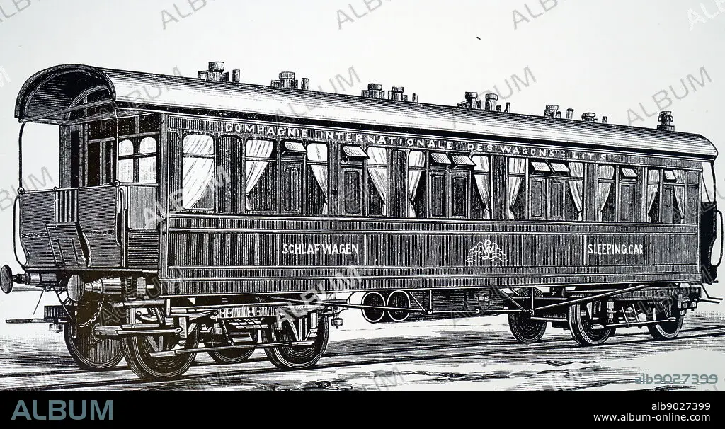 Engraving depicting the exterior view of a sleeping car on the Orient Express. Dated 19th century