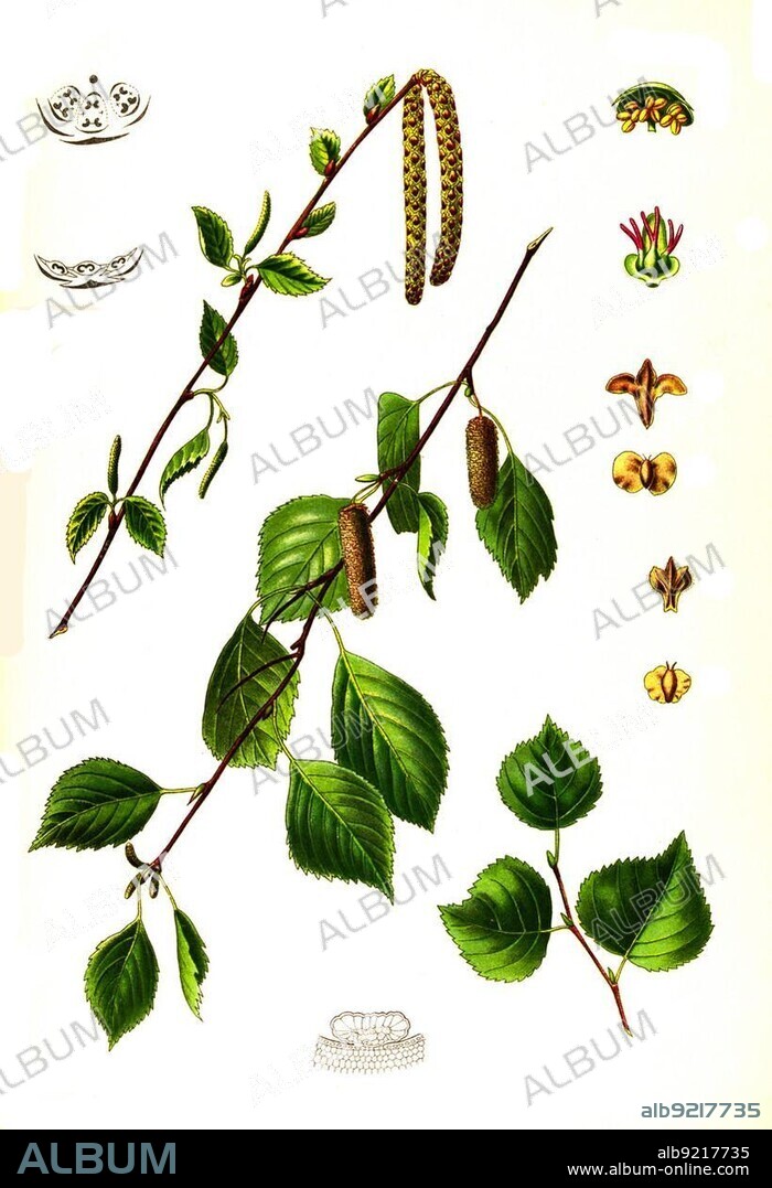 Caption: Hanging birch (Betula alba) (Betula verrucosa), also sand birch, white birch (Betula pubescens) or warty birch (Betula pendula) (top), Bog birch, also hairy birch, broom birch, glass birch or moor birch (bottom), Historical, digitally restored reproduction from an 18th century original