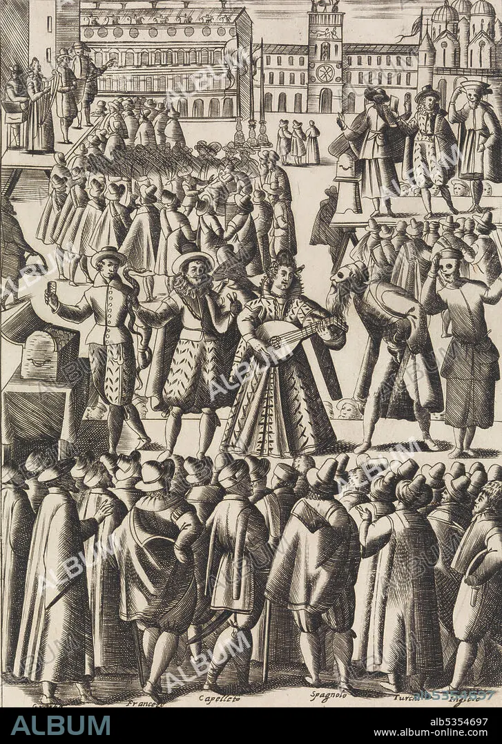 Intartenimento che dano ogni giorno li Ciarlatani in Piazza di S. Marco al Populo, d'ogni natione che mattina e sera ordinariamente, ui concore. [Entertainment given daily by the charlatans in Piazza San Marco to the people of every nation, who gather there in the mornings and evenings]. From Habiti d'huomeni et donne Venetiane, [The Customs of Venetian men and women].