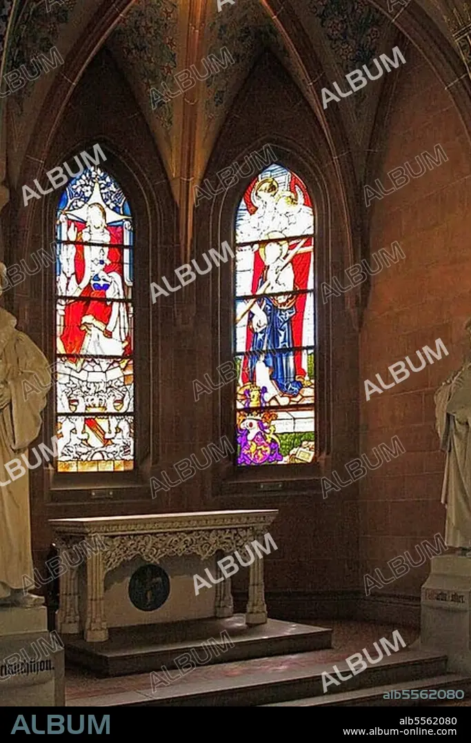 Melanchthon House, Memorial Hall, Reformation statues of Philipp Melanchthon and Martin Luther, altar with Melanchthon coat of arms, choir window, Bretten, Kraichgau, Karlsruhe County, Baden-Württemberg, stained glass windows, Germany, Europe