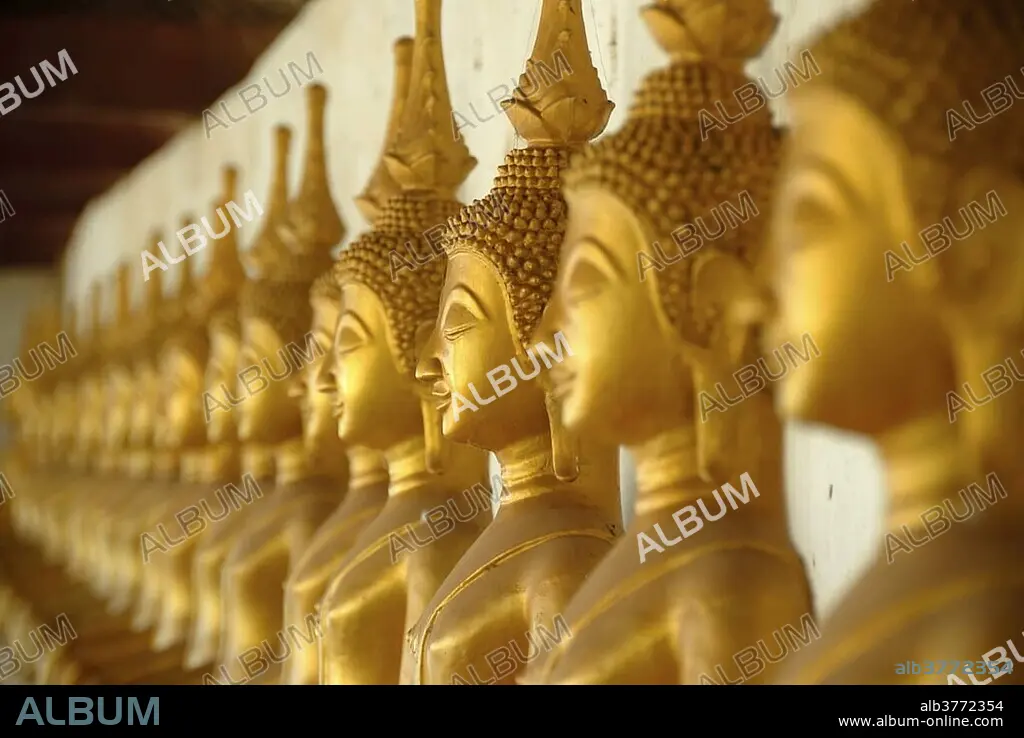 Caption: Theravada Buddhism, meditation, row of golden Buddha statues, temple, That Ing Hang Stupa, in Savannakhet, Laos, Southeast Asia, Asia