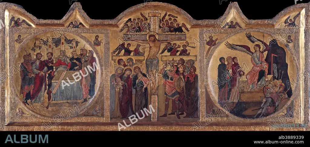 Caption: Kreuzigungsretabel aus Soest / Altarpiece with crucifixion from Soest. Date/Period: Ca. 1240. Painting / altarpiece. Oak wood. Height: 86 cm (33.8 in); Width: 195.5 cm (76.9 in).