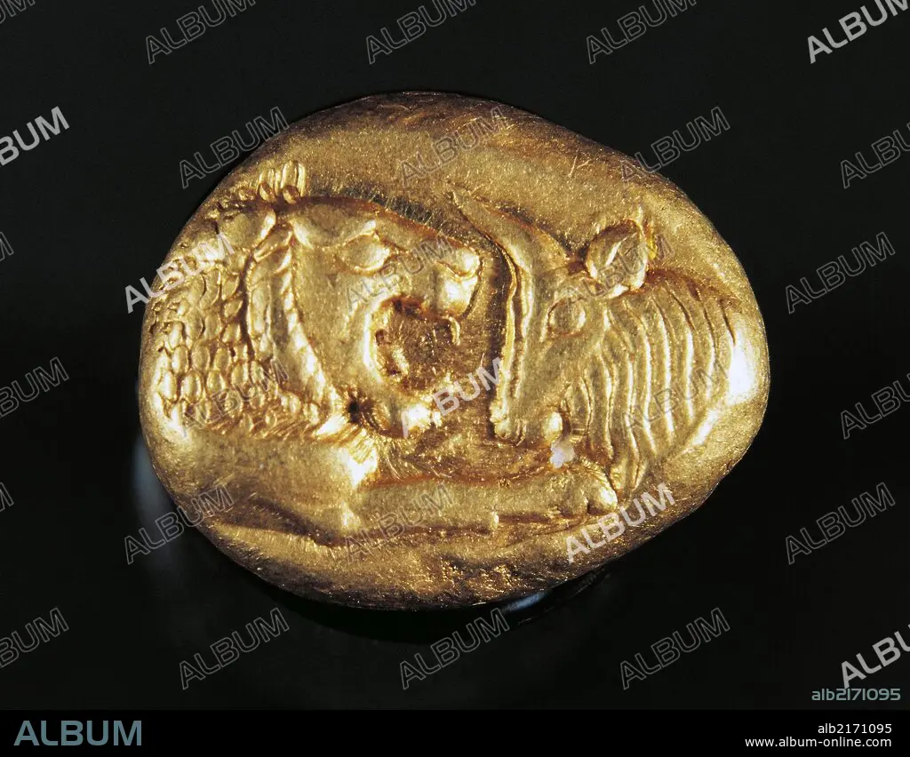 Gold stater of King Croesus depicting a lion facing a bull. Greek coins, 7th century BC.